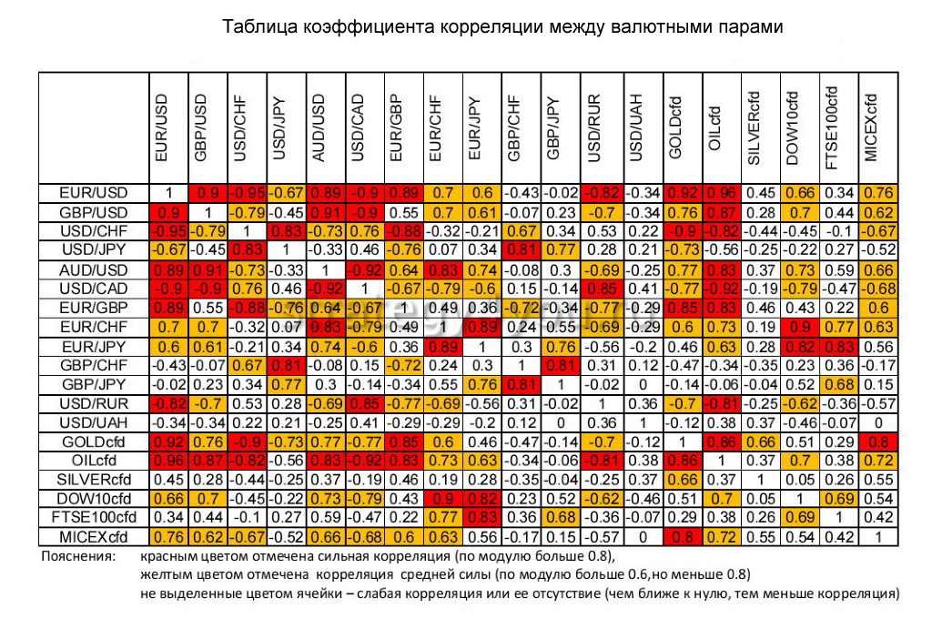 Таблица ниже демонстрирует, как происходит корреляция валютных пар Форекс: