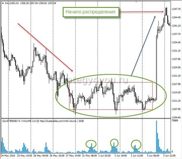 В период, когда происходит накопление, а также при распределении на рынке нет волатильности, поэтому отсутствуют движения, требуемые для того, чтобы трейдер получил прибыль. В такой ситуации ордера группируются примерно на одном уровне.