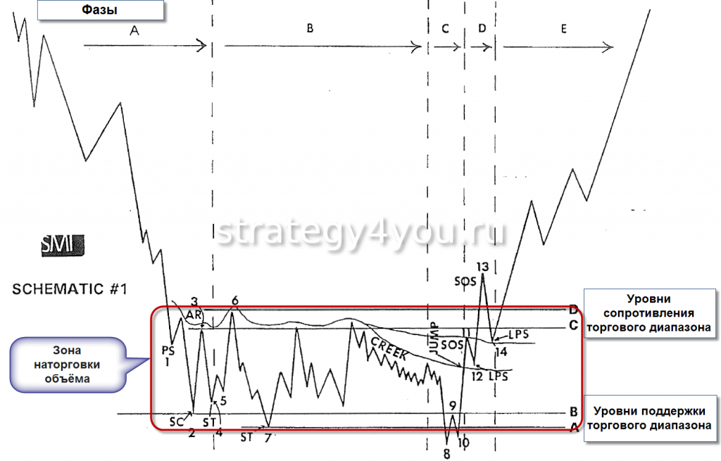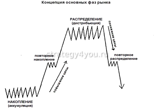 Если рассмотреть ценовое движение, то можно выделить фазу, когда происходит накопление. После этого начинается восходящий тренд, его сменяет фаза распределения. После нее тренд меняет свое направление, начинается падение котировок.
