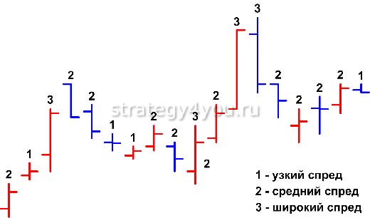 Например, когда цена движется вверх, считается, что происходит усиление. Если при этом спред у свечи выше среднего при увеличивающихся значениях объема, то это свидетельствует о том, что на актив высокий спрос. Справедлива и обратная ситуация.