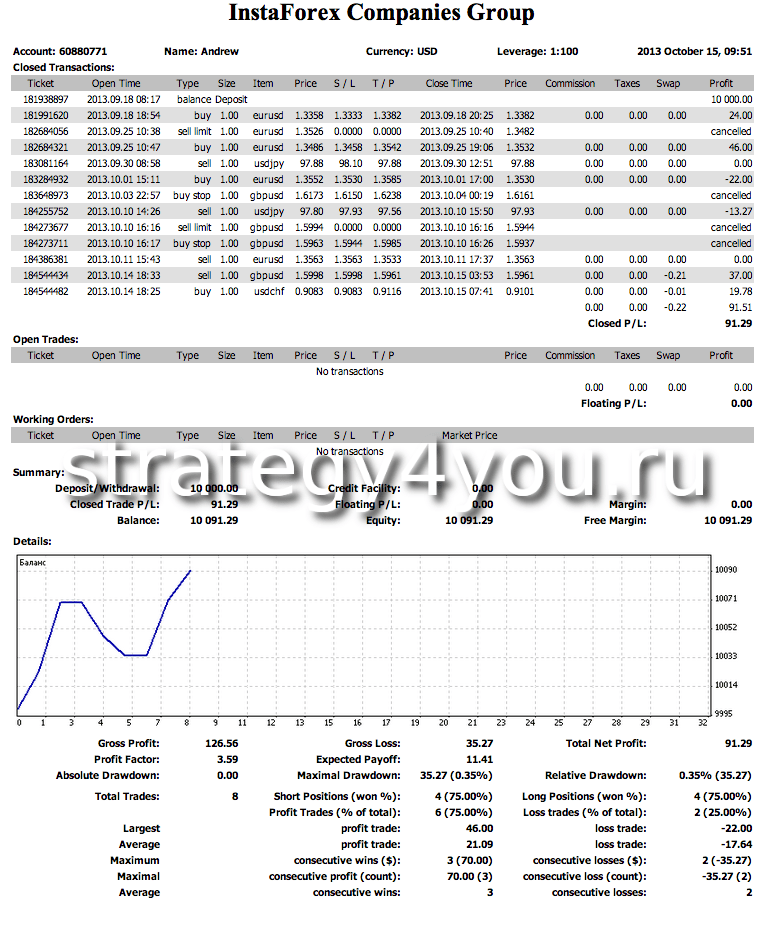 Тест проводился не при помощи советника форекс, а это реальный тест при помощи торговли на МТ4 в компании Инстафорекс: