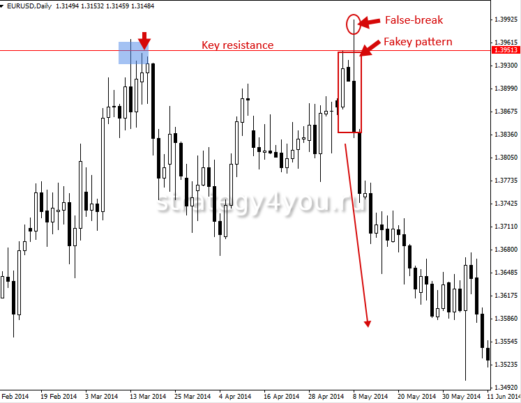 - Если паттерн Fakey также имеет пин-бар, вы можете войти в сделку на самом пин-баре.