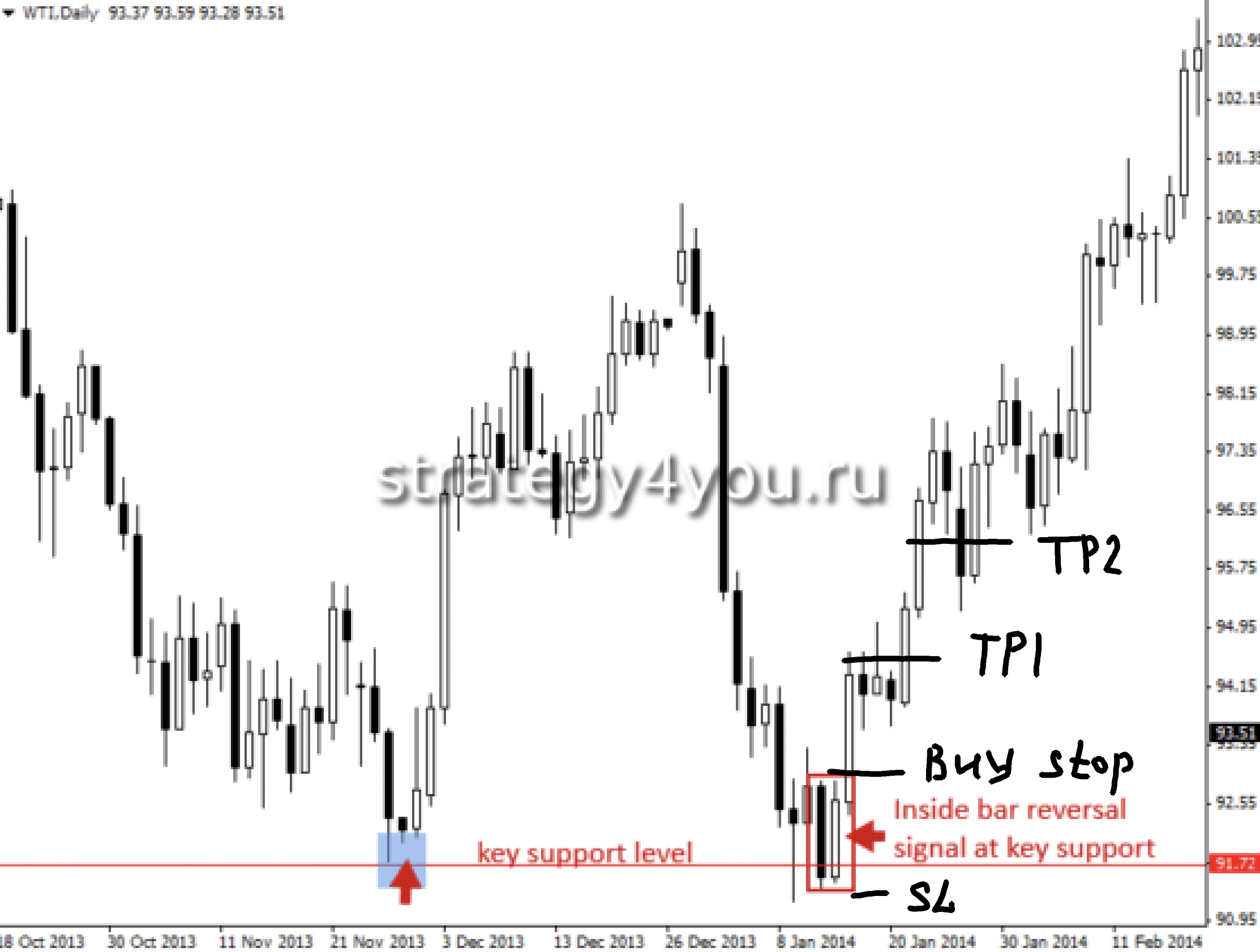 1) Если мы замечаем на графике инсайд бар и цена при этом отбивается от уровня снизу, то мы выше максимума внутреннего бара ставим ордер на покупку Buy Stop.