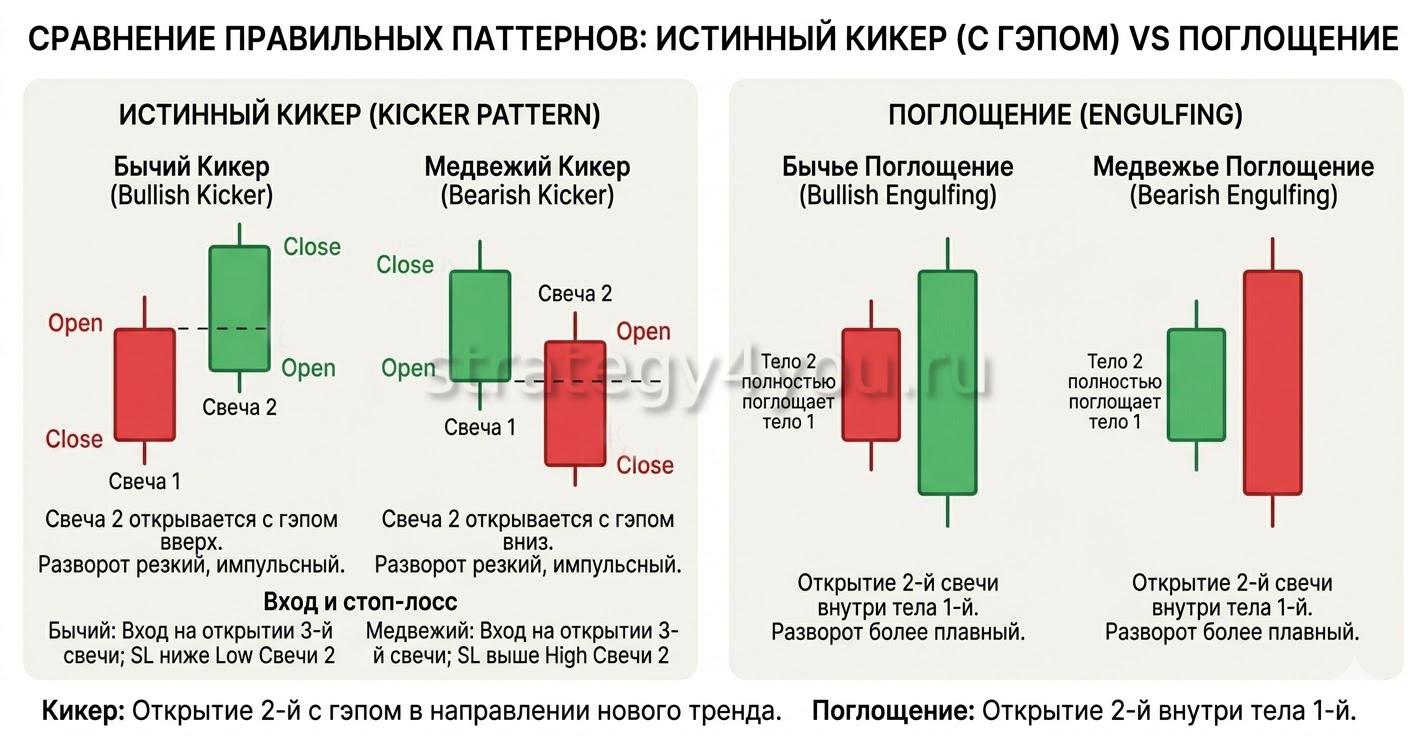 Если коротко: Поглощение — разворот «мягкий», Kicker — разворот «жёсткий». Именно поэтому Кикер даёт более сильный импульс после формирования.