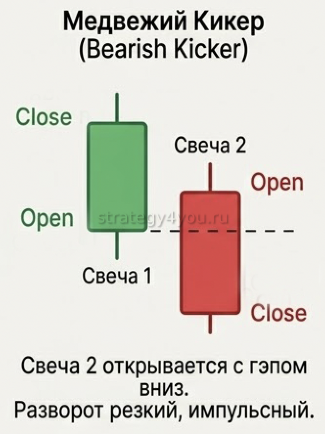 Паттерн Kicker (Кикер) — это двухсвечной разворотный паттерн Price Action, при котором вторая свеча открывается на том же уровне, что и первая, и движется строго в противоположном направлении. Считается одним из сильнейших сигналов смены тренда в свечном анализе.