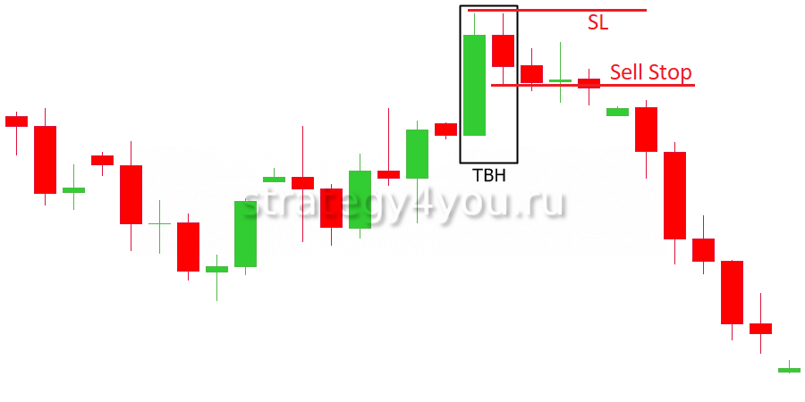 - Паттерн TBH формируется на бычьем тренде. На графике образуется свеча роста с тенью сверху, за которой формируется свеча снижения, у этой свечи верхняя тень совпадает с тенью предыдущего подсвечника. Итог: цена 2 раза достигала максимум и не смогла пробить его.