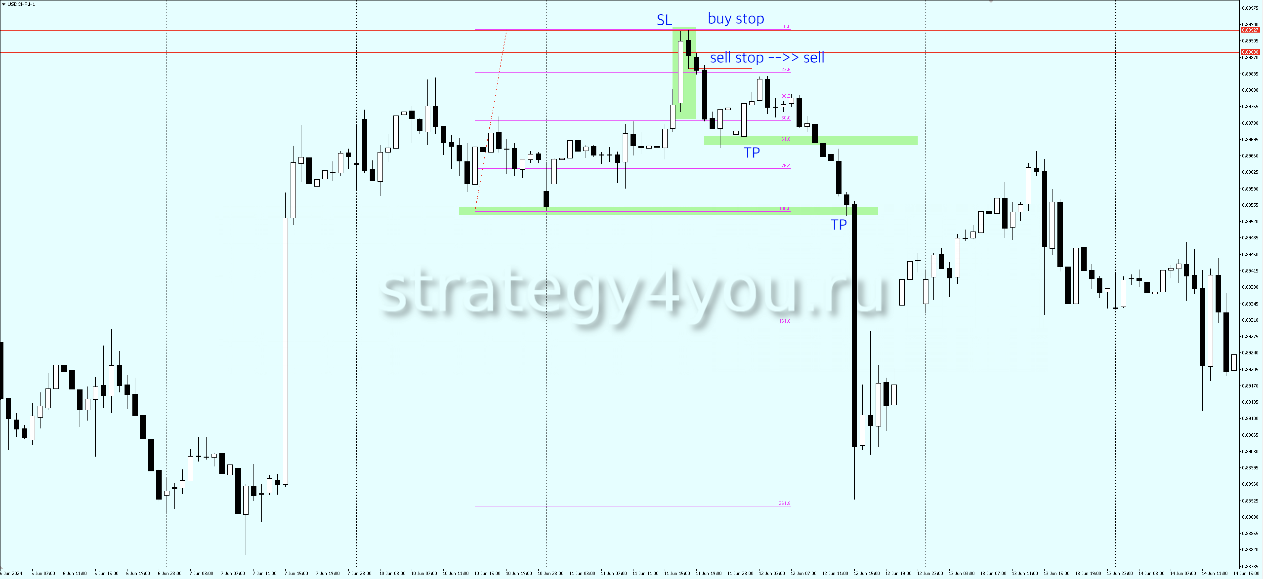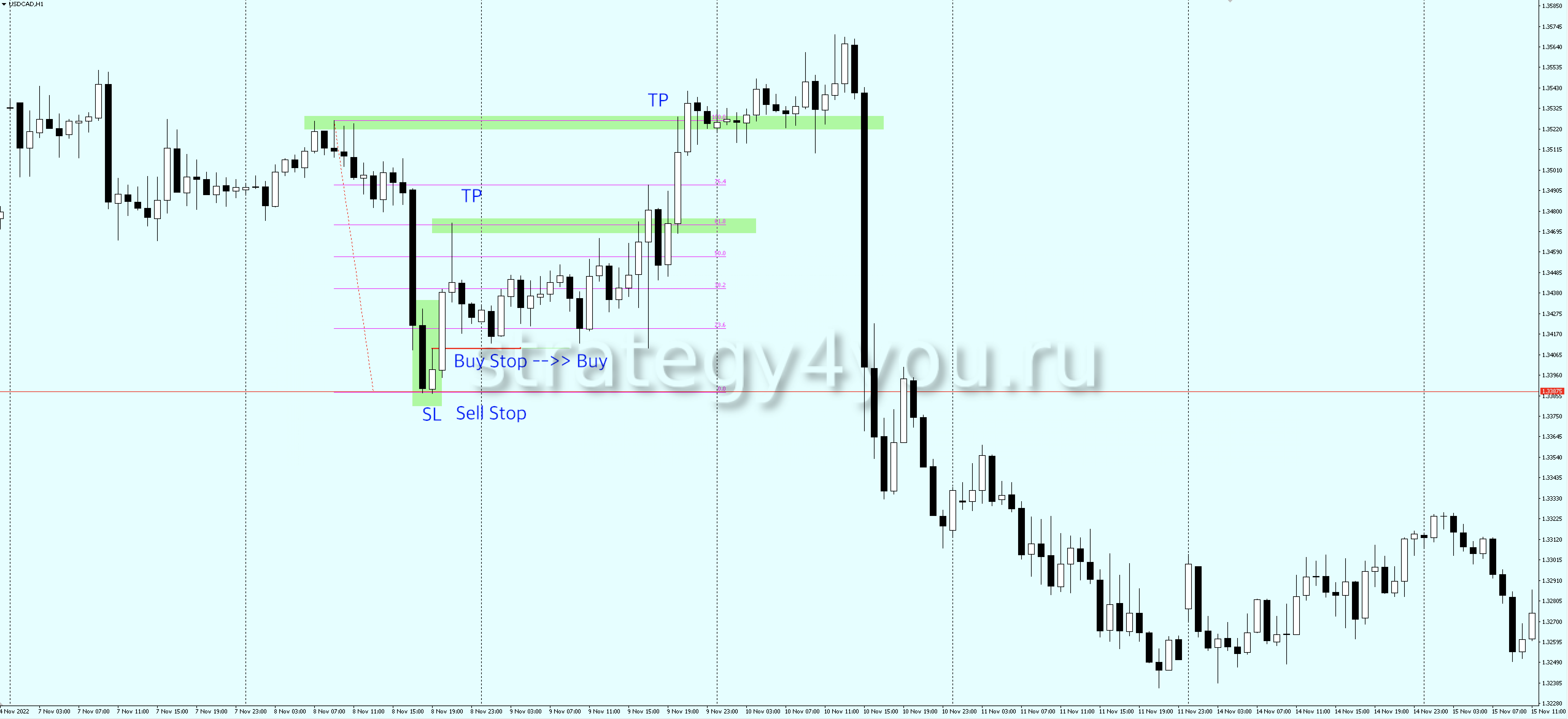 - Для ордера Sell stop, стоп лосс устанавливаем на уровне ордера Buy stop.