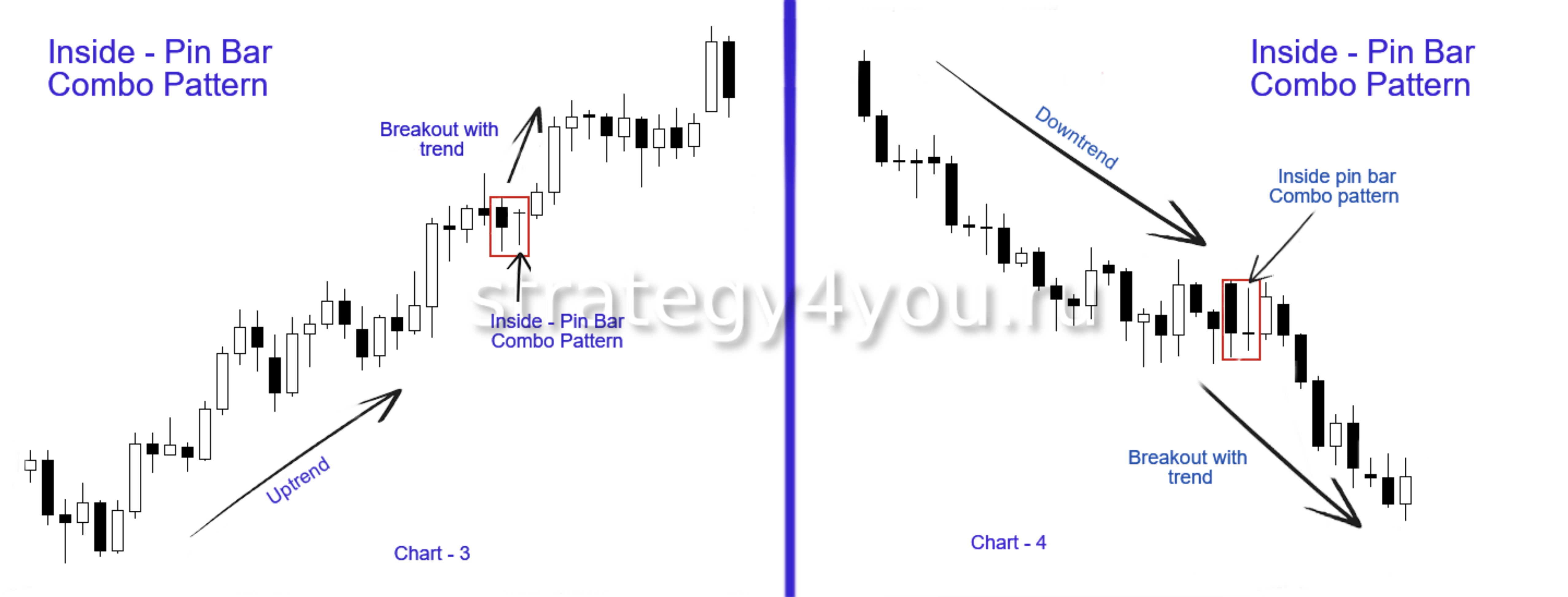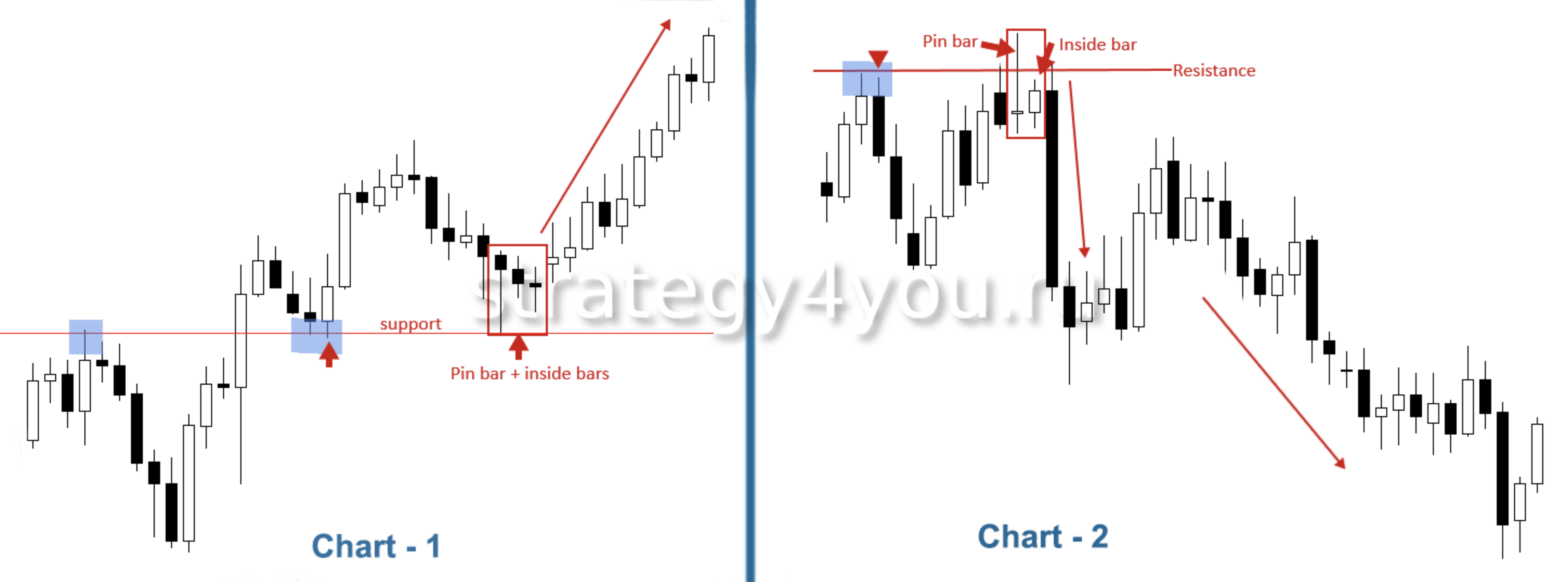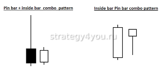Когда эти два сигнала объединяются, мы получаем результат: либо в виде комбинации пин-бара и внутреннего бара, либо в виде комбинации внутреннего бара и пин-бара.