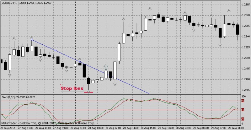 5) После открытия ордера, при движении цены в сторону заключения сделки, строим восходящую линию тренда и переносим стоп-лосс на «минимум — 5 пунктов» свечи, пробившей линию тренда сверху-вниз.