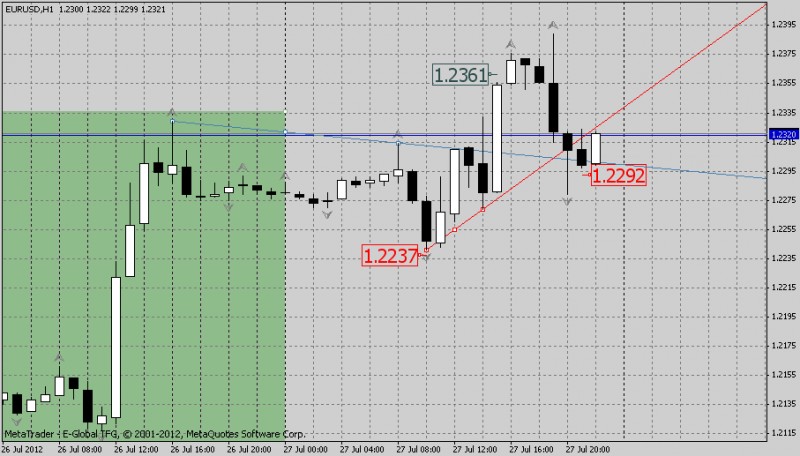 7. Гуляй: выкладываю скрин ситуации 27 июля, перестраивать линию тренда по моему мнению не надо. Был пробой длинной свечой нисходящей линии тренда и линии сопротивления, цена дальше не пошла и при окате пробила восходящую линию тренда. стоп-лосс перенесен на 5 пт ниже минимума, но он не сработали пока позиция не закрыта. Есть вероятность открытия с Гэпом вверх в понедельник, тогда возможно удастся перевести в безубыток.