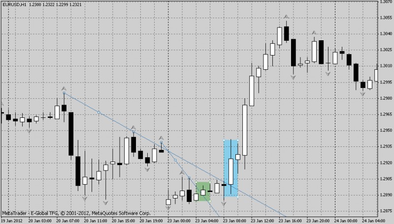 Пример сделки: пробой линии и движение вверх. В красных квадратах указаны цены стоп-лосса и цены закрытия ордера. Зеленый квадрат — ордер на покупку.