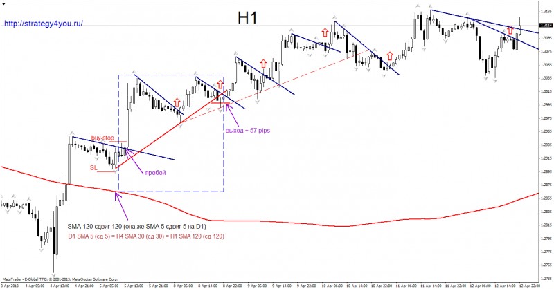 30. Олег: сделки можно заключать на на каждом откате внутри отрезка. Допустим на дневном графике произошло пересечение SMA вверх. На Н4 проводим горизонтальные линии поддержки и сопротивления. Переходим на Н1 если происходит откат вниз проводим линию нисходящего тренда для Н1. лучше конечно по фракталам. но можно и просто по максимумам. Входим по отложенному ордеру на свече пробившей эту линию. Если отката не случилось то входим на пробое горизонтальной линии сопротивления, проведенной на интервале Н4.