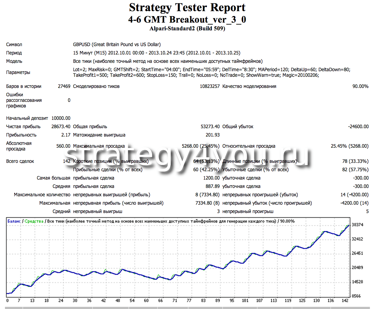 Тест стратегии был проведен при помощи Советника 4-6 GMT Breakout Strategy, который не использует в своей основе сигналы индикаторов, валютная пара GBPUSD, интервал — M15.