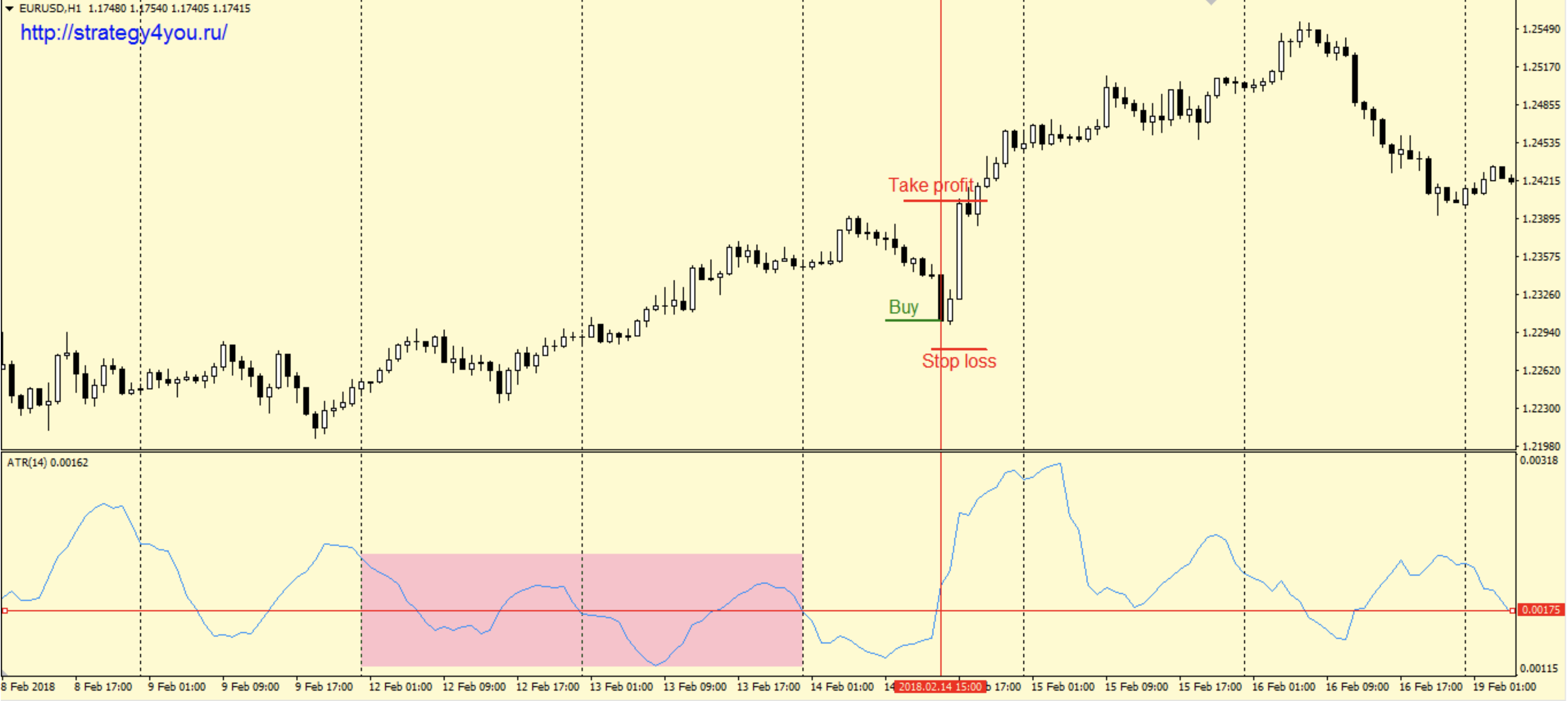 1) На закрытии очередного дня следует выделить диапазон движения индикатора ATR за предыдущие два дня (от максимума до минимума).