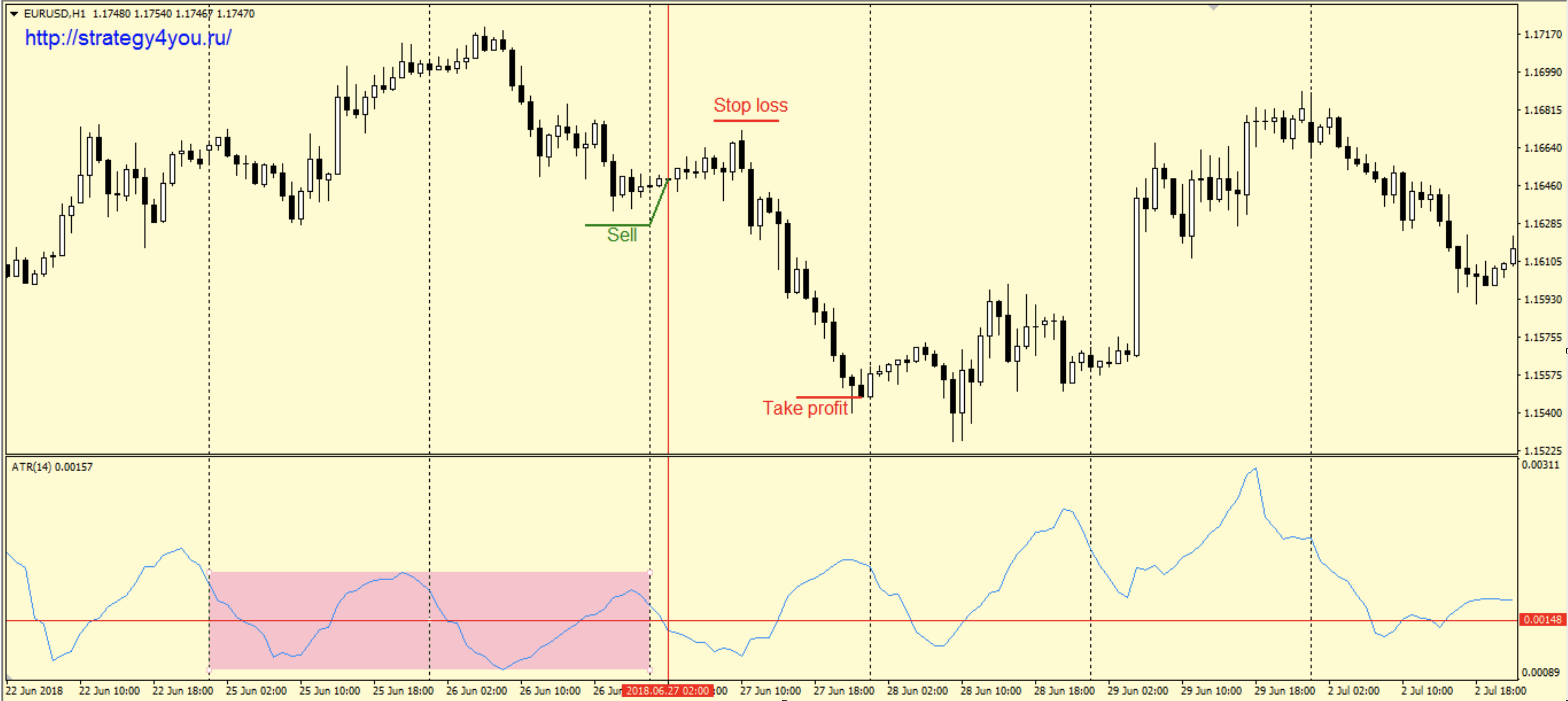3) Если первое пересечение этой линии произойдет сверху вниз, то на закрытии свечи, на которой индикатор ATR закрепился ниже центральной линии, заключается сделка на продажу.