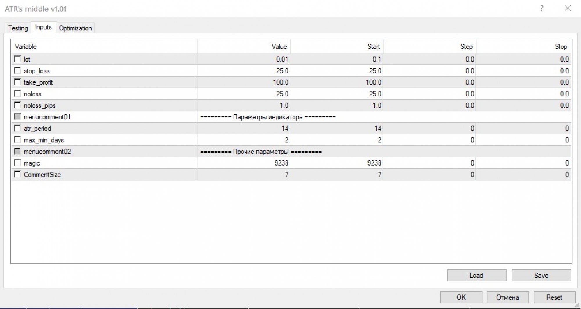 - Индикатор ATR с периодом 14.