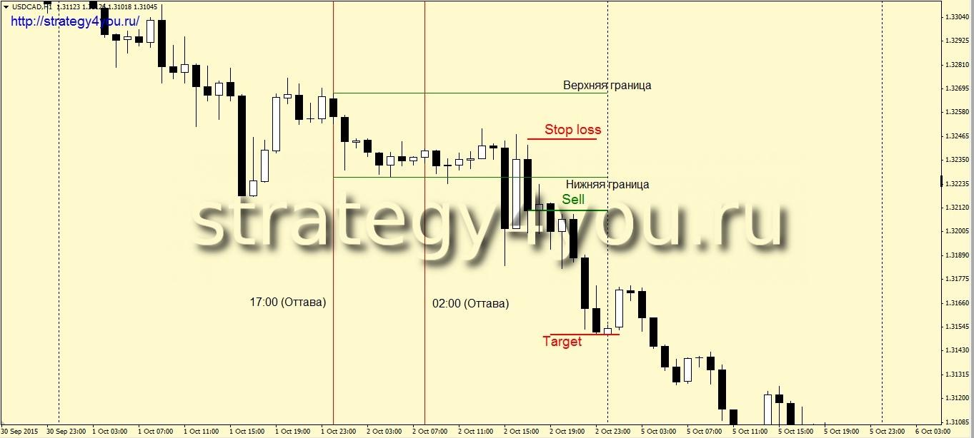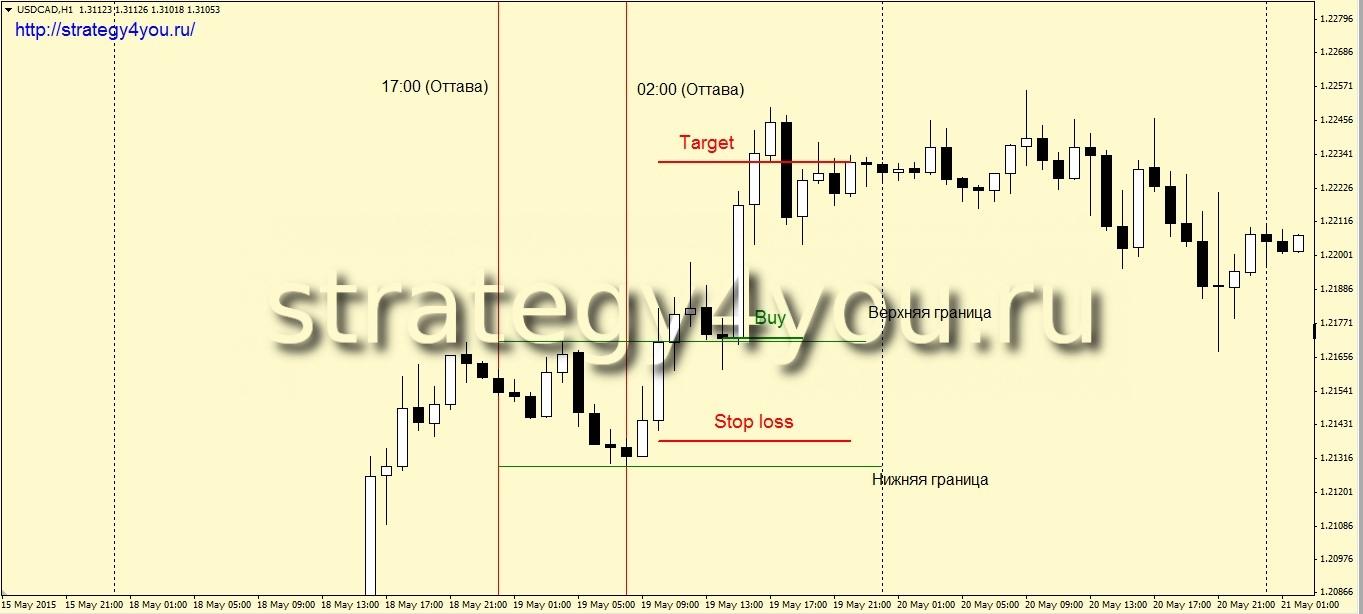 1) Нужно построить ценовую коробку с 17:00 до 02:00 (время по Оттаве). За указанный период времени определяем максимум и минимум, а потом по ним строим горизонтальные линии.