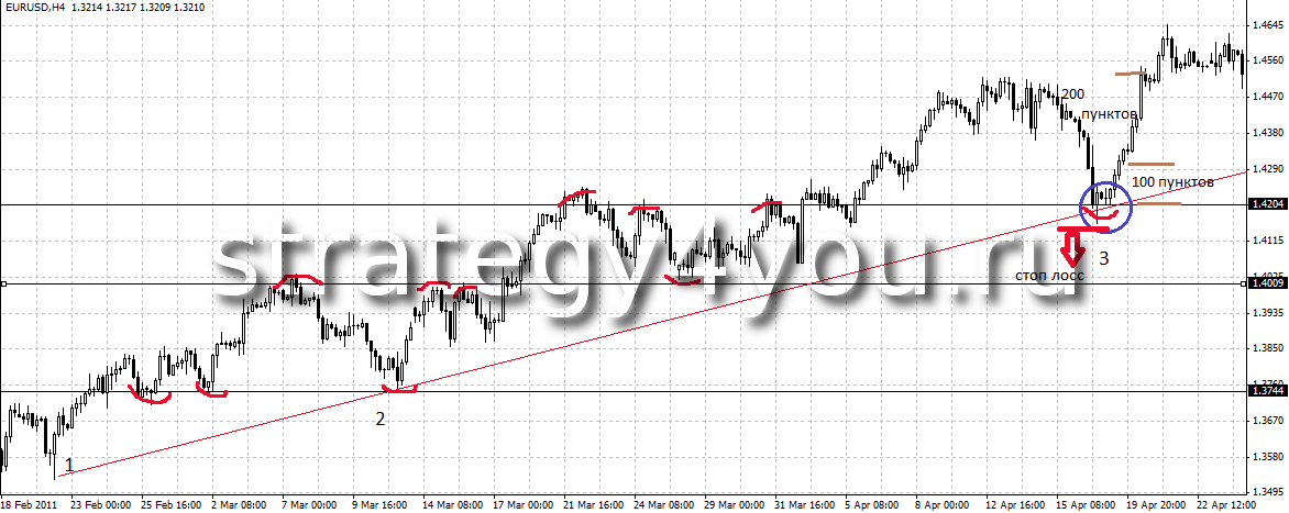 1) Позиция открывается при восходящем тренде, после третьего касания об линию поддержки,