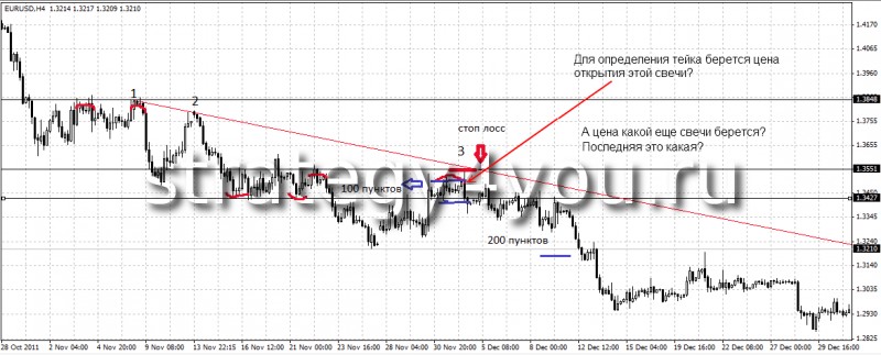 4) тейк профит высчитывает несложным подсчетом: берется точка открытия свечи (начало тела) последнего минимума и цена закрытия последней свечи, после чего количество пунктов удваивается.