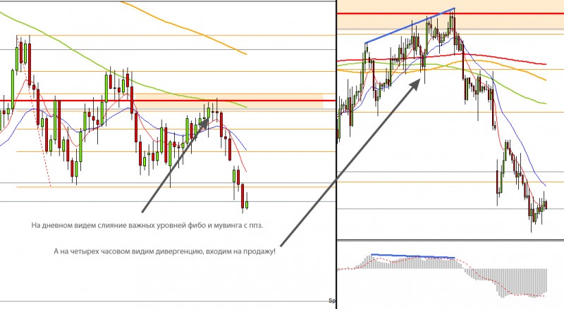Dok, естественно мувинги это формально индикатор, но на мой взгляд это не индикатор даже а некое усредненное значение цены (мы ведь и смотрим на цену). Ведь мувинги выступают как поддержка и сопротивление, а не только как индикатор направления тренда. В том и суть, что слияние мувинга с зоной ценового пивота — это мощная зона сопротивления/поддержки. Допускаю использование MACD для выявления дивергенций, например совсем недавно на дневном графике EUR/USD была 99.9% успешная ситуация для сделок на продажу, цена подошла к 365 дневной скользящей, которая слилась с важным пивот-уровнем, и зоной фибо, а на Н4 видна дивергенция MACD. Наглядно: