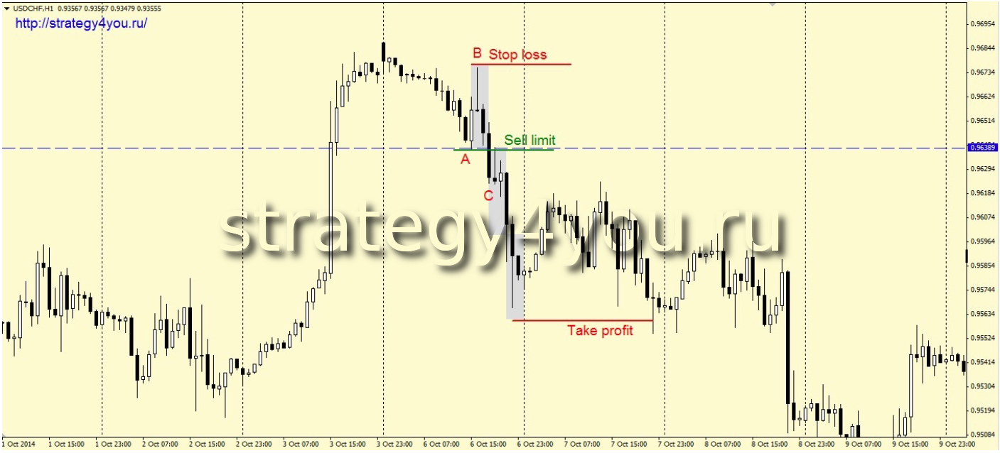 5) На уровне точки «А» устанавливается Sell-Limit ордер на продажу (при условии, что цена не прошла от нее расстояние больше чем величина стоп-лосса).