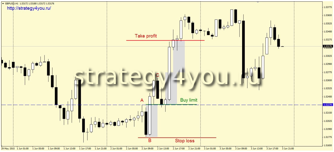 5) На уровне точки «А» устанавливается лимитный ордер на покупку (при условии, что цена не прошла от нее расстояние больше чем стоп-лосс).
