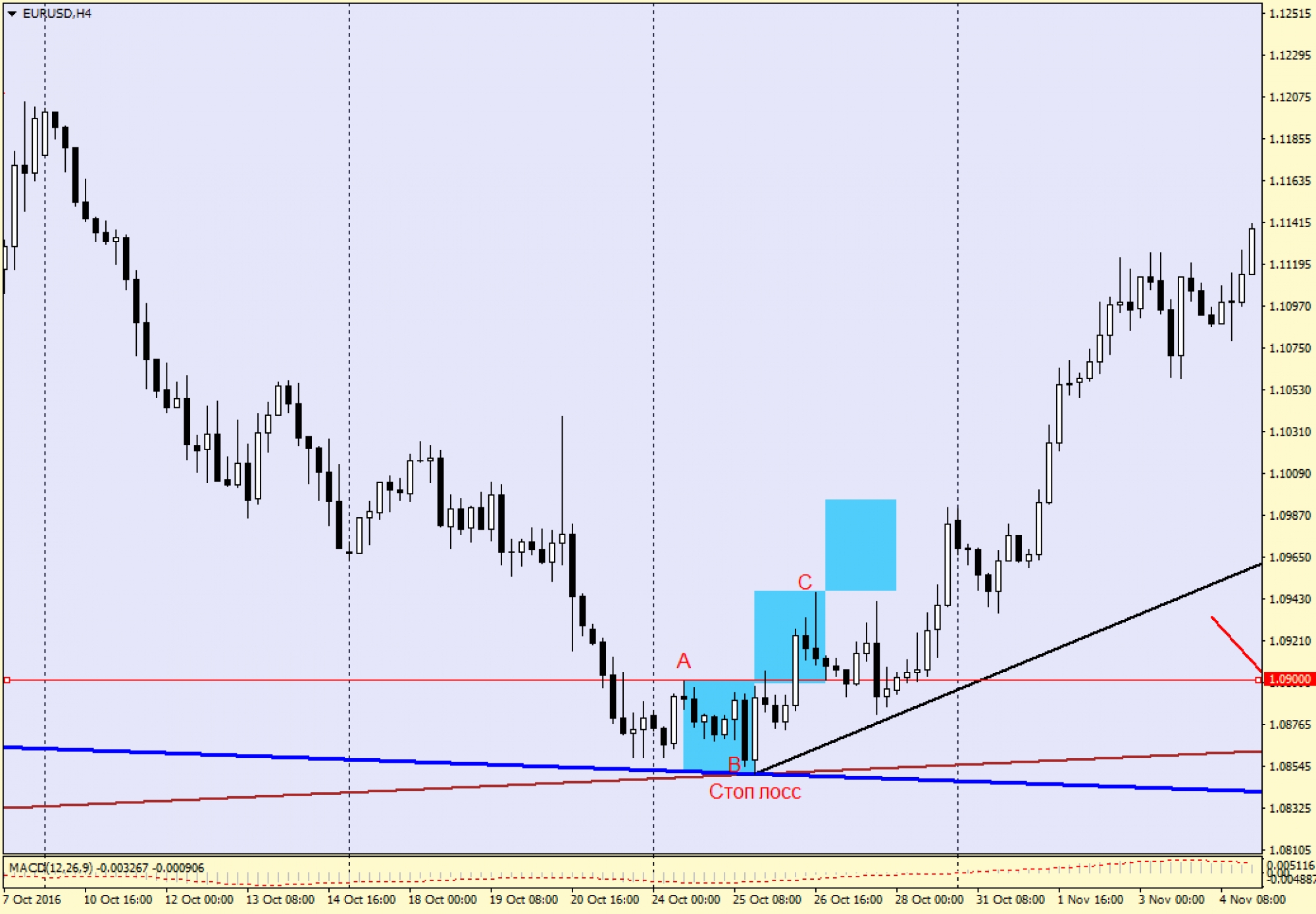 4) На довольно резком импульсном движении (этот пункт самый важный!!!) цена переписывает последний максимум (точка «А») и формирует точку «С».