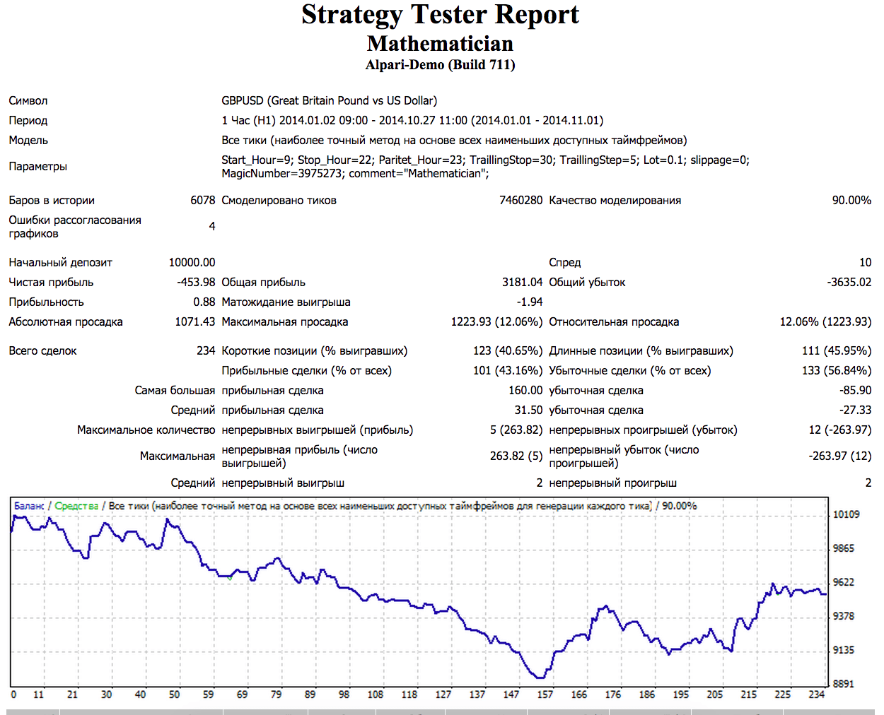 У меня его хватило только на полтора месяца (с 01,09,2014 по 15,10,2014) и за этот период стратегия принесла бы по паре EUR/USD 714 пунктов при максимальной просадке 102 пункта (4 убыточные сделки подряд).