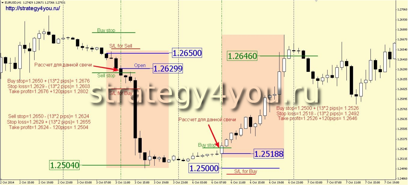 3) Stop loss для обоих ордеров устанавливается на расстоянии 26 пп (13х2) от цены открытия сигнальной свечи.