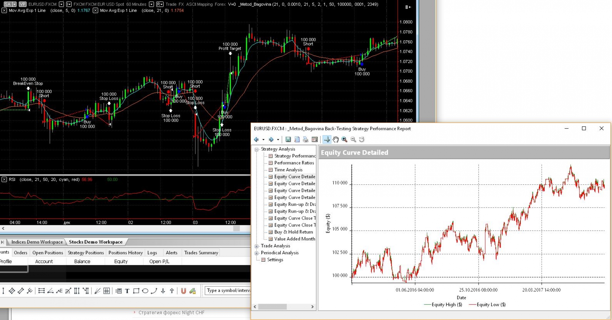 Стратегия форекс «Метод Баговино» очень проста, торговля ведется на часовом графике (H1), на него нужно установить EMA (close) с периодом 5 и 21. А так же индикатор RSI с периодом 21. Все данные индикаторы есть в любом стандартном наборе терминала MetaTrader 4.