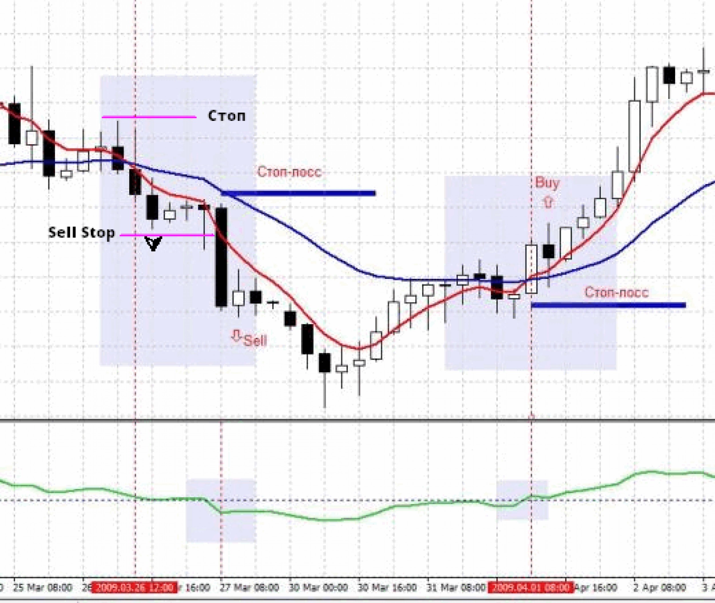В первый раз (ситуация слева) — сначала произошло пересечение мувингов, но заключили сделку мы лишь спустя несколько часов, после того, как RSI пересек уровень 50 и закрылся ниже него.