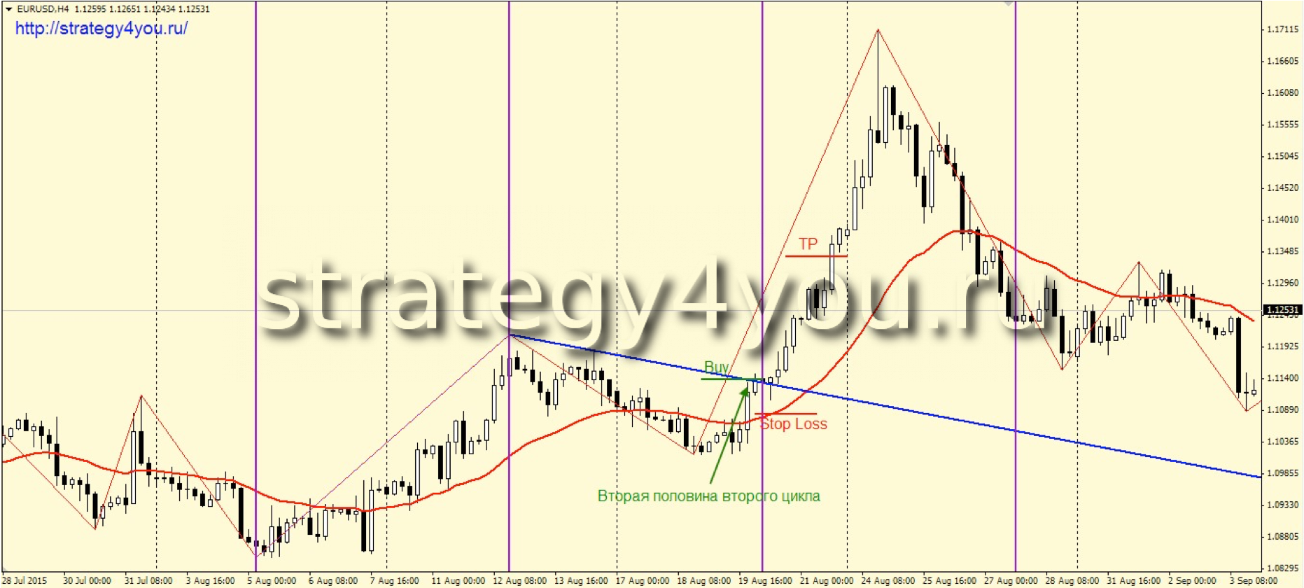 3) Если цена в момент пробоя этой линии вверх (с обязательным закрытием 4Н свечи) находится выше МА30 и так же находится уже во второй половине 2-ого цикличного отрезка, то на открытии следующей свечи открывается сделка на покупку.