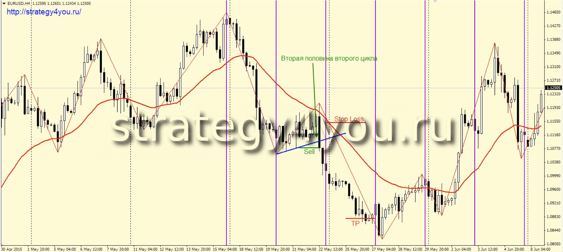 3) Если цена в момент пробоя этой трендовой линии вниз (с обязательным закрытием 4Н свечи ниже нее) находится ниже скользящей средней МА30 и так же находится уже во второй половине 2-ого цикличного отрезка, то на открытии следующей H4 свечи открывается сделка на продажу.
