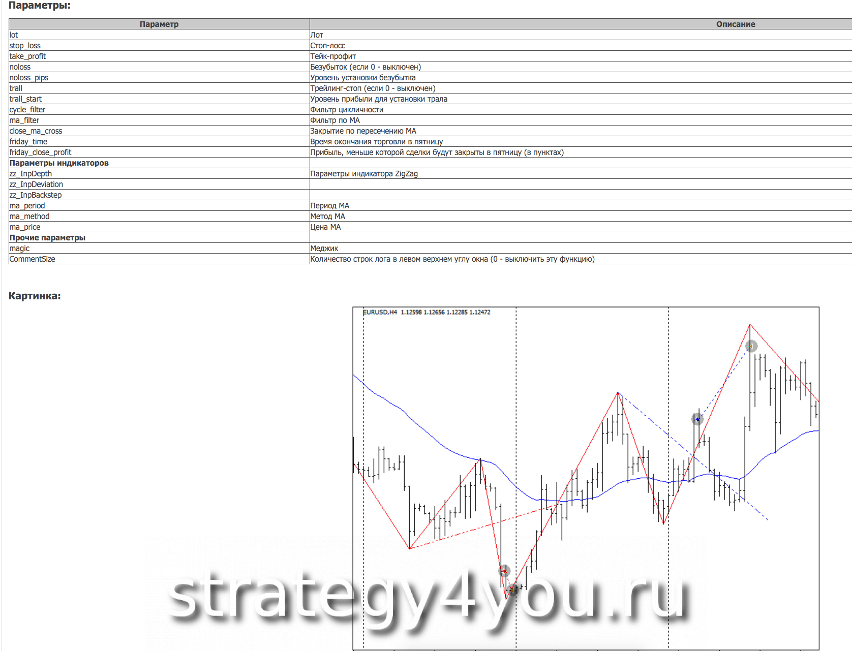 Советник открывает сделку при пробое (с закрытием свечи) трендовой линии, проведенной между пиком зигзага и вершиной цен между двумя последними пиками для ордеров Buy. Для ордеров Sell — зеркально.