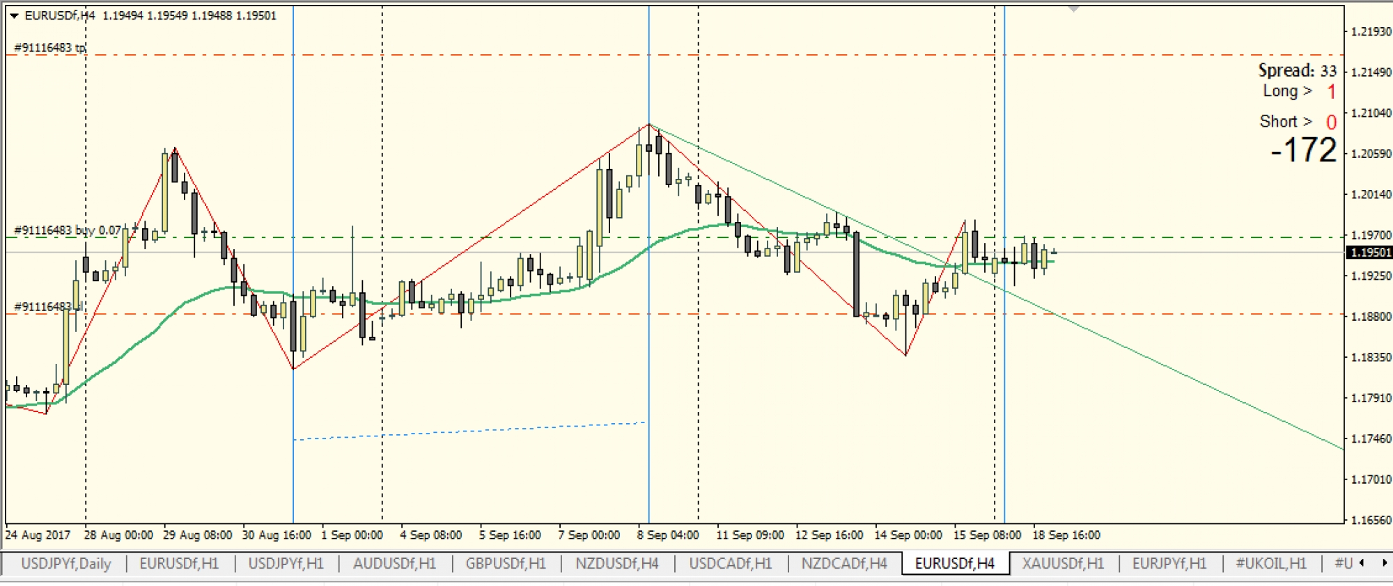 При поиске стратегий требующих минимальное время для торговли еще раньше обратил внимание на эту стратегию. Но только сейчас решил попробовать, на истории становиться ясным что 1 сделка в месяц есть, бывают месяцы и без сигналов, полный стоп редкое явление, если мы закрываемся по стратегии когда цена вернулась обратно за трендовую линию, не дожидаясь стопа тогда фиксируем текущий убыток. В прошедшую пятницу вошел по сигналу, так как входил с телефона, получилось войти не с лучшей ценой, можно было войти с большего отката, но что есть то есть. Прикрепляю скрин