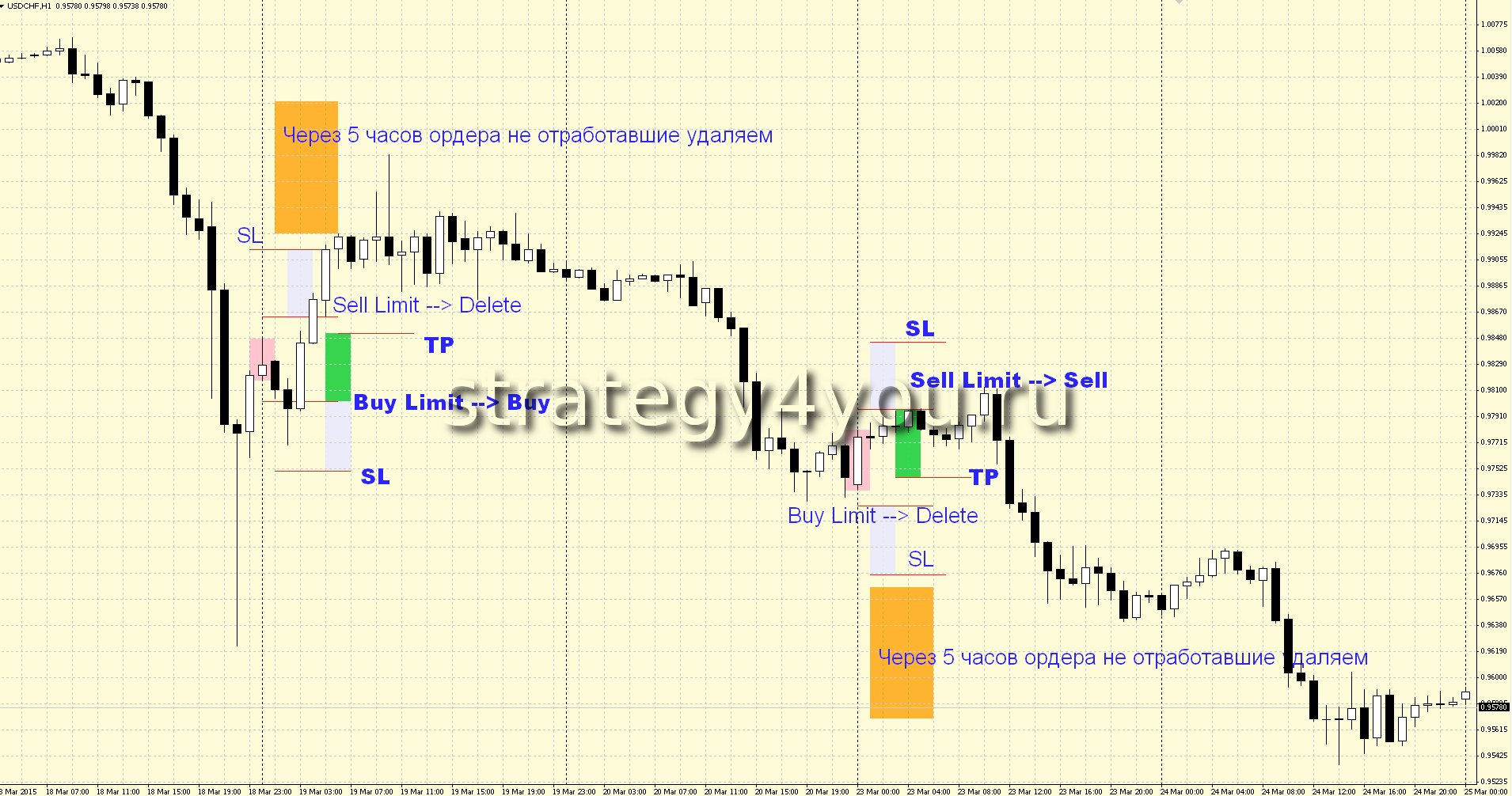 Проводимые исследования, были направлены на поиск отскоков (возвратов) цены в рамки временной коробки, поэтому работа по данной стратегии форекс будет осуществляться ордерами BUY LIMIT и SELL LIMIT.