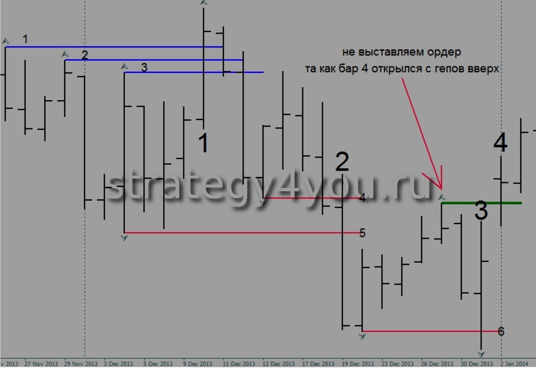 - На данном графике GOLD мы видим 6 успешно отработанных ордера. Синего цвета ордера buy stop, красного sell stop. Как мы видим на дневном баре номер 1 у нас сработало 3 ордера на buy stop, так как у нас перед этим баром было 3 фрактала, мы и выставили 3 ордера на покупку. На баре под номером 2 у нас сработало 2 ордера на продажу и на 3 баре у нас сработал 1 ордер на продажу. Так же на графике есть линия зелёного цвета, это пример где не стоит входить в позицию, так как бар номер 4 на котором должен был сработать ордер на покупку, открылся сильным гепом вверх!