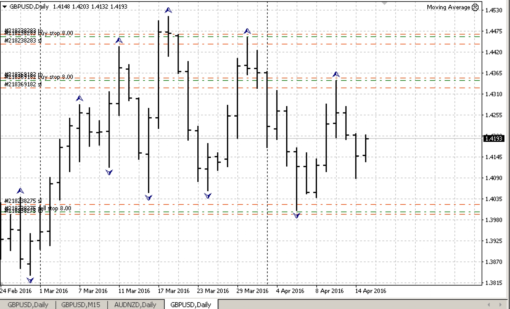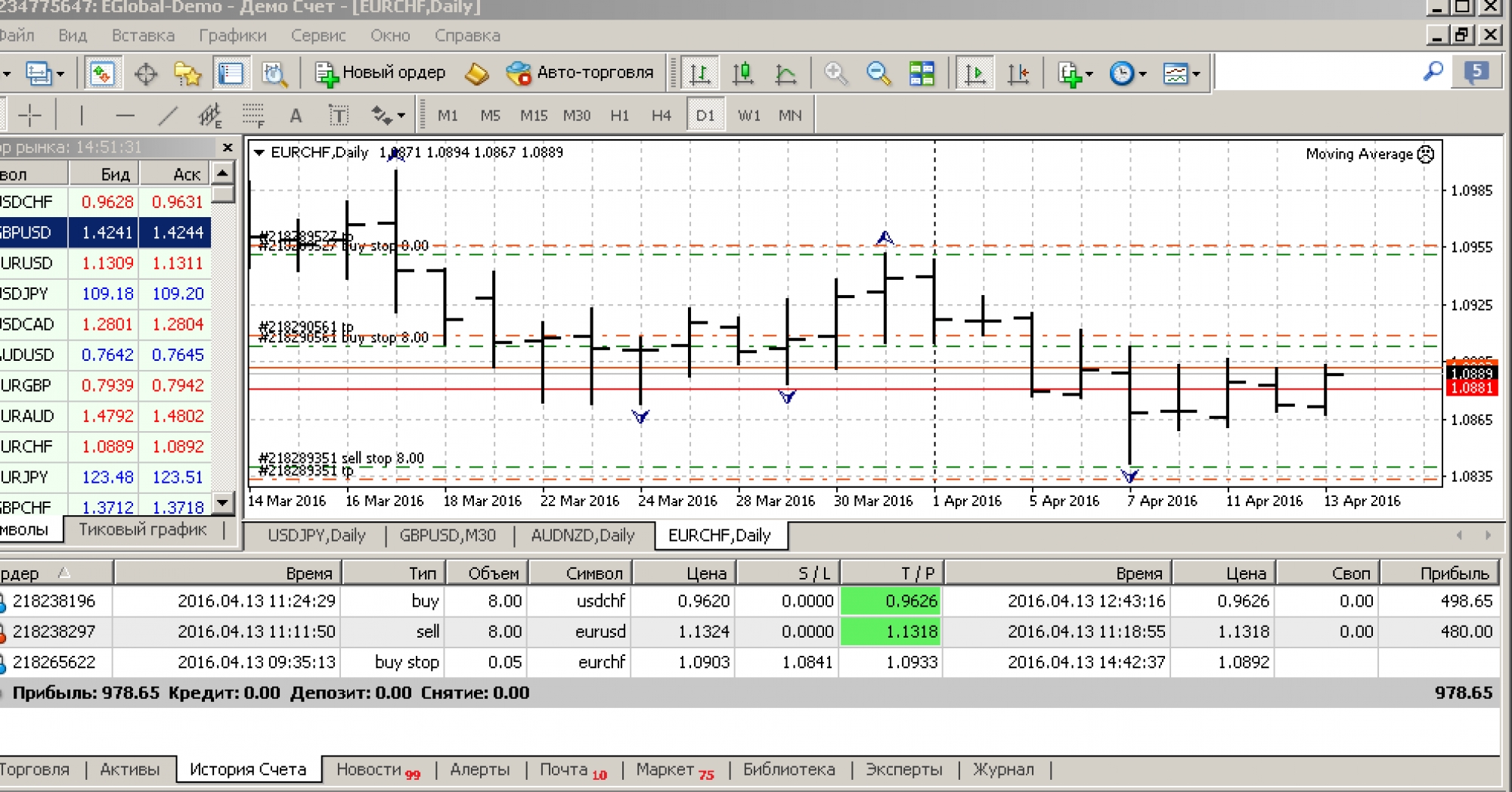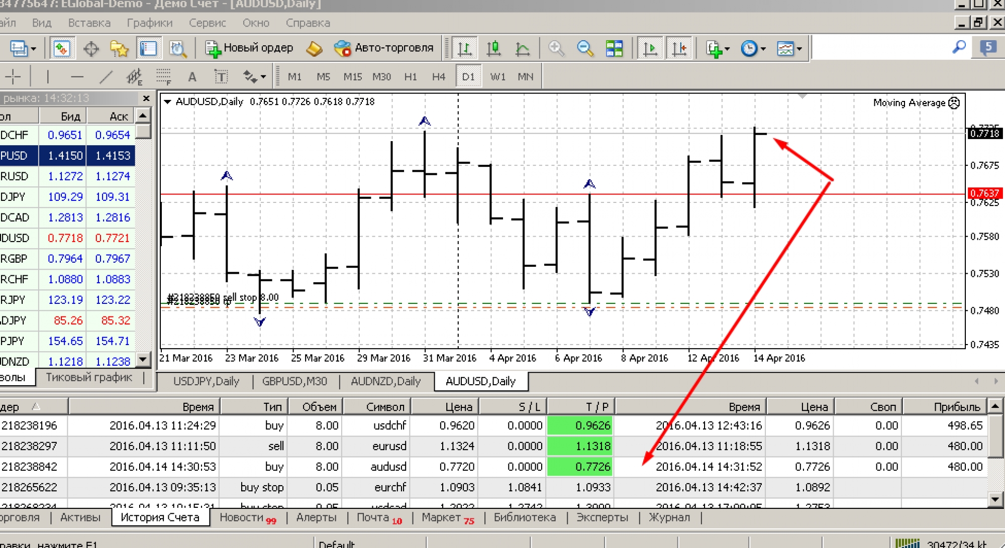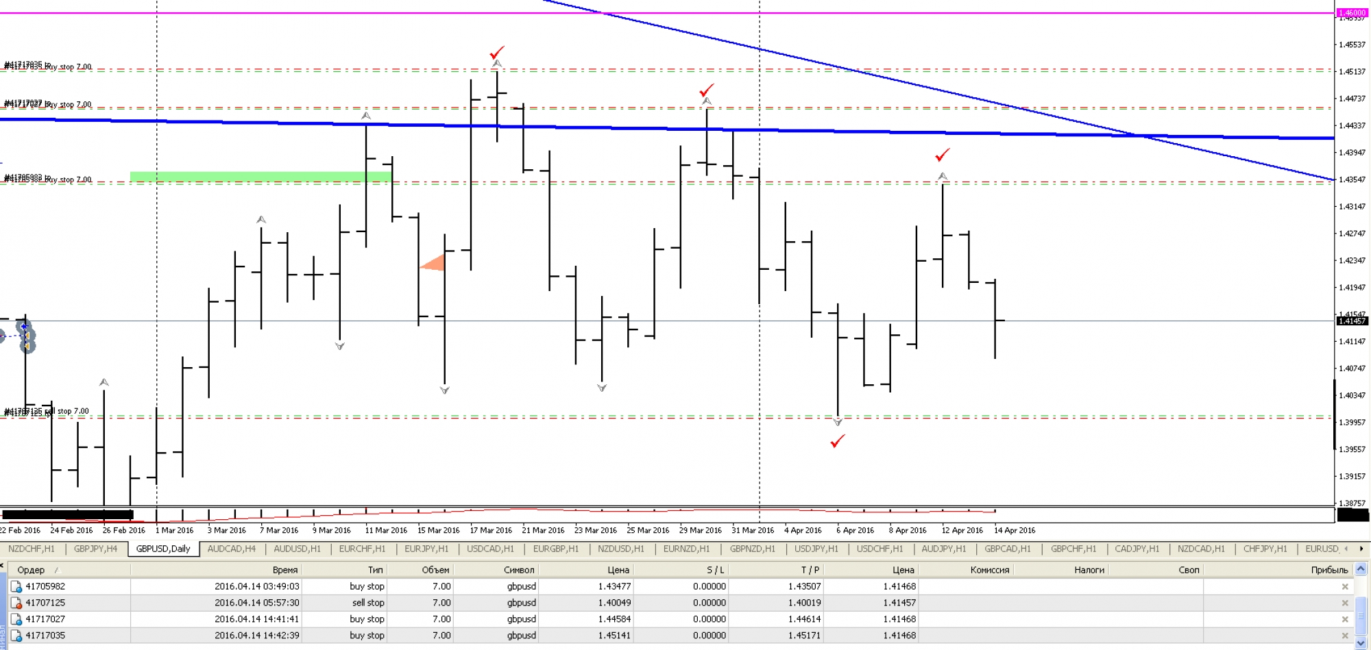 2. На данном графике GOLD мы видим 10 успешно отработанных ордеров на покупку (синего цвета) и 7 успешных ордеров на продажу (красного цвета). И того у нас 17 успешных сделок за три с половиной месяца и всё это на дневных графиках.