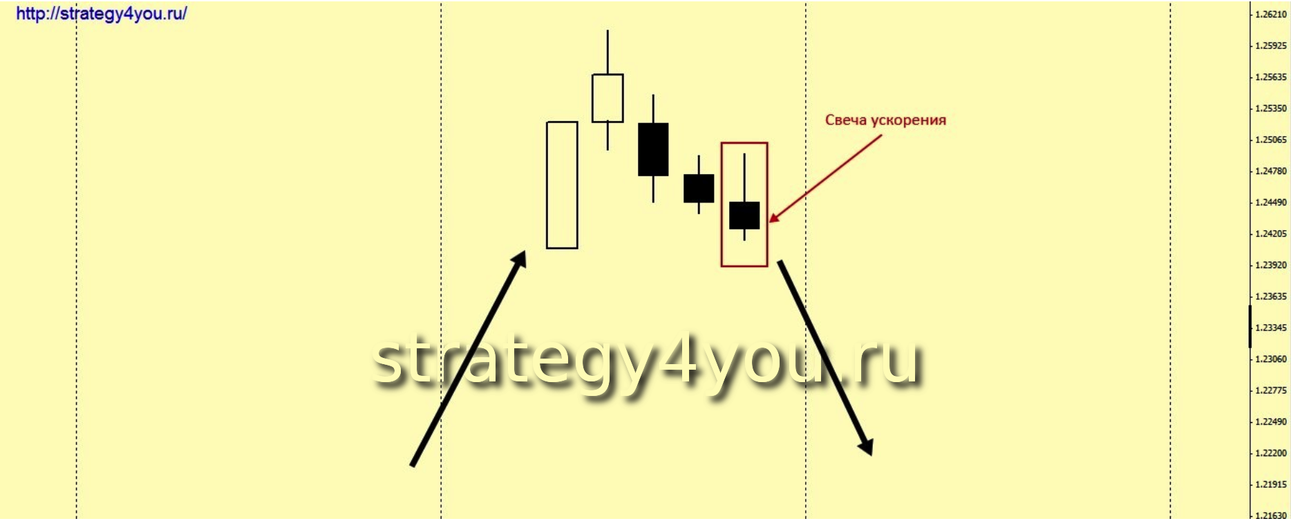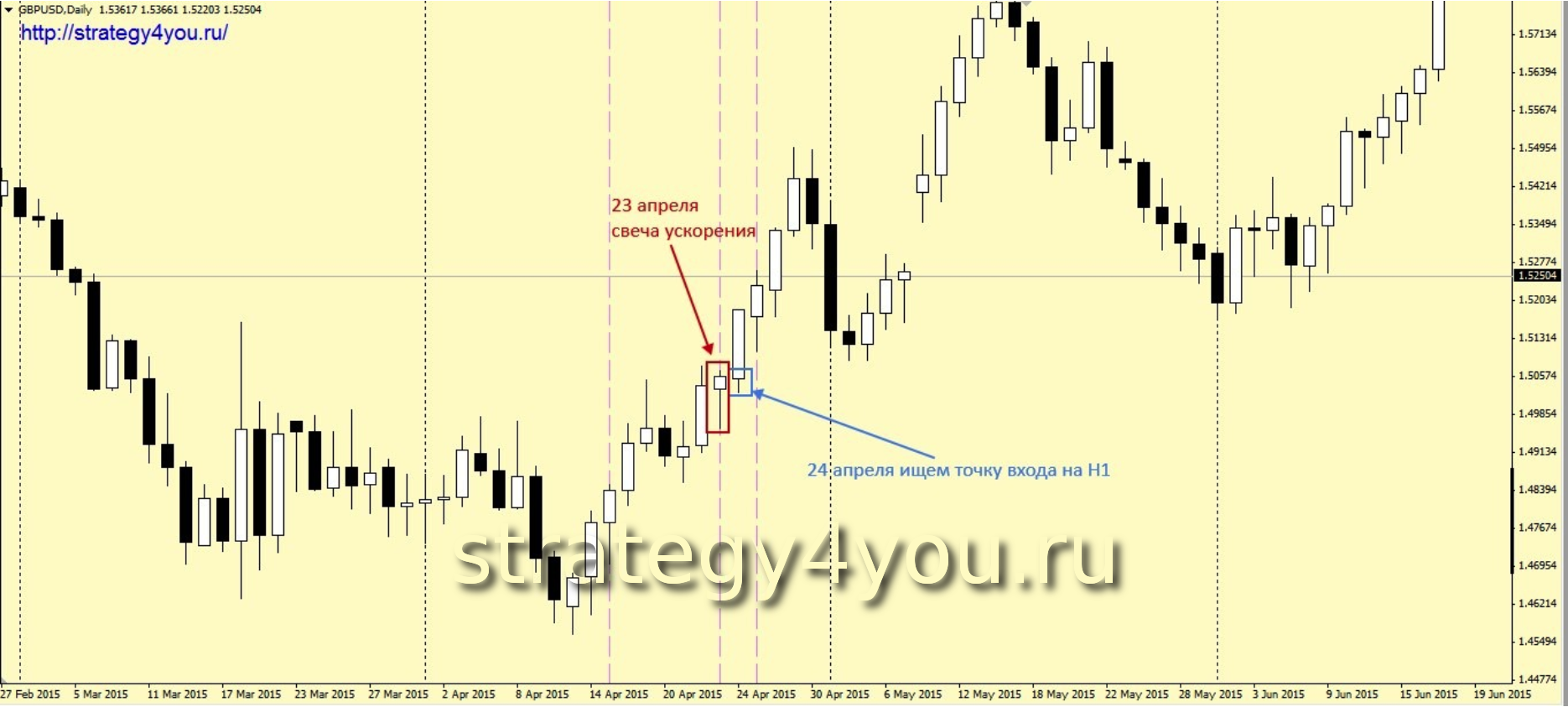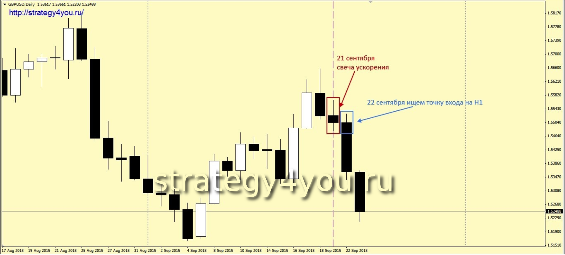 Временной интервал для торговли:- На дневном интервале (D1) идентифицируется свеча ускорения.