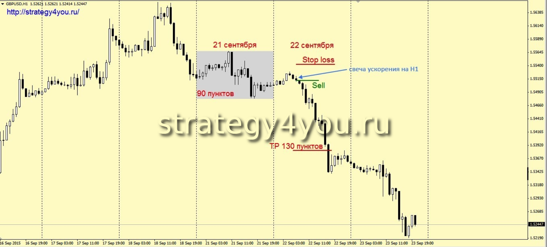 2) После перехода на часовой график сразу следует установить ордер селл-стоп ниже минимума сформированной свечи ускорения ровно на 5 пунктов.