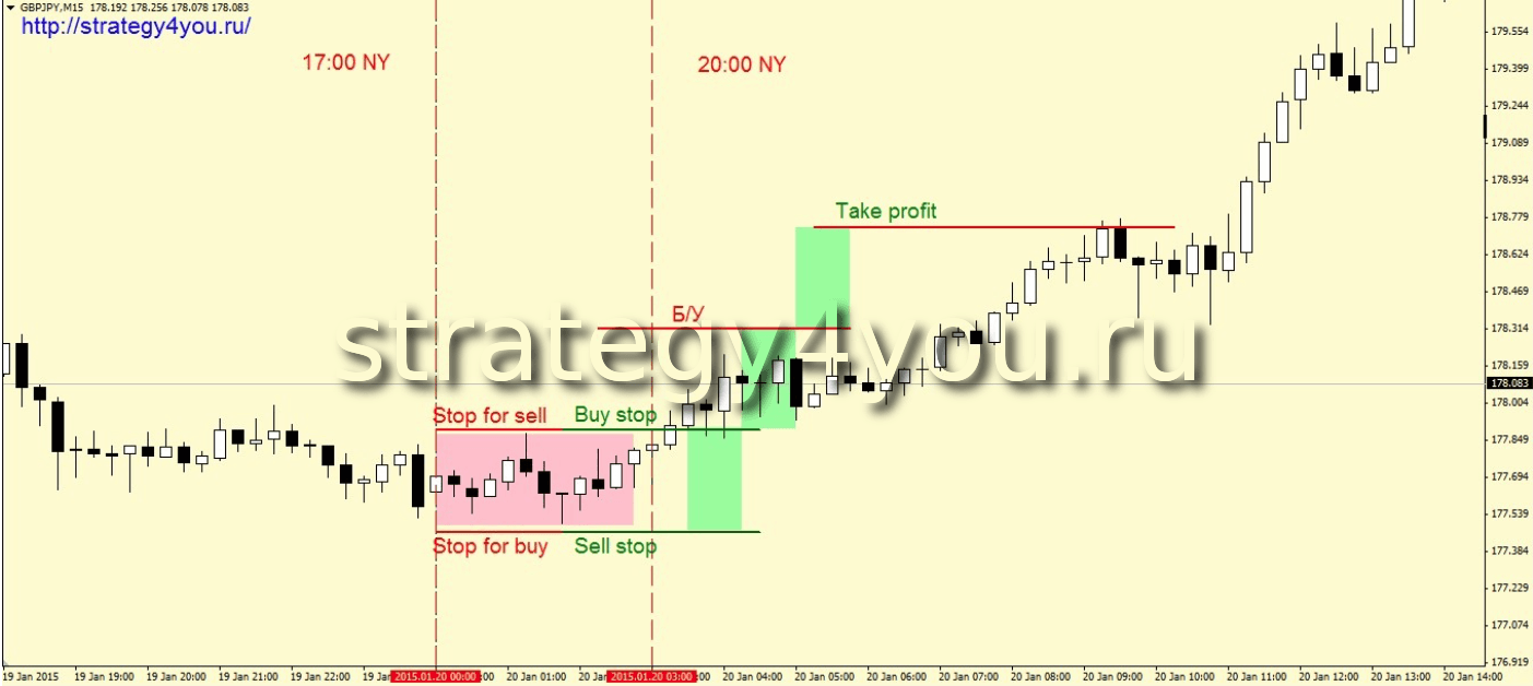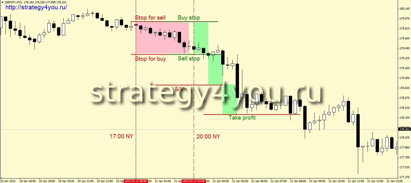 4) Если на момент начала следующего временного отрезка (17:00 по Нью-Йорку) сделка находится в положительной зоне, то ее следует перевести в безубыток в любом случае. Если же цена на тот момент будет находится в отрицательной зоне, то сделку следует закрыть по рыночной цене. Стоит также обратить внимание на другую тему.