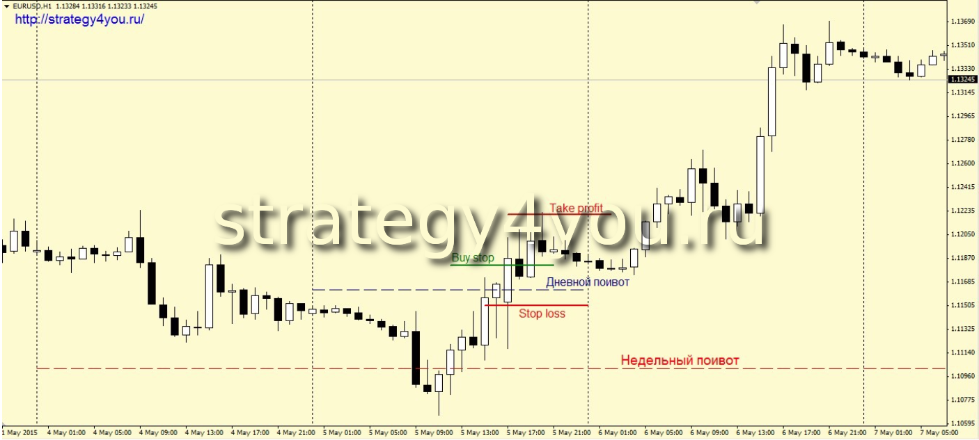Рассмотрю пример на покупку. В данной стратегии я изменил лишь то, что когда цена в момент открытия дня находится выше дневного и недельного уровня, я жду когда она опустится в течении дня ниже дневного уровня и ЗАКРЕПИТСЯ там (т.е. часовая свеча закрылась ниже дневного пивот уровня) и лишь тогда я выставляю бай стоп. Если цена и так ниже дневного уровня, то просто выставляем бай стоп. Стоп лосс 30 п., тейк профит 40 п., безубыток 20п.