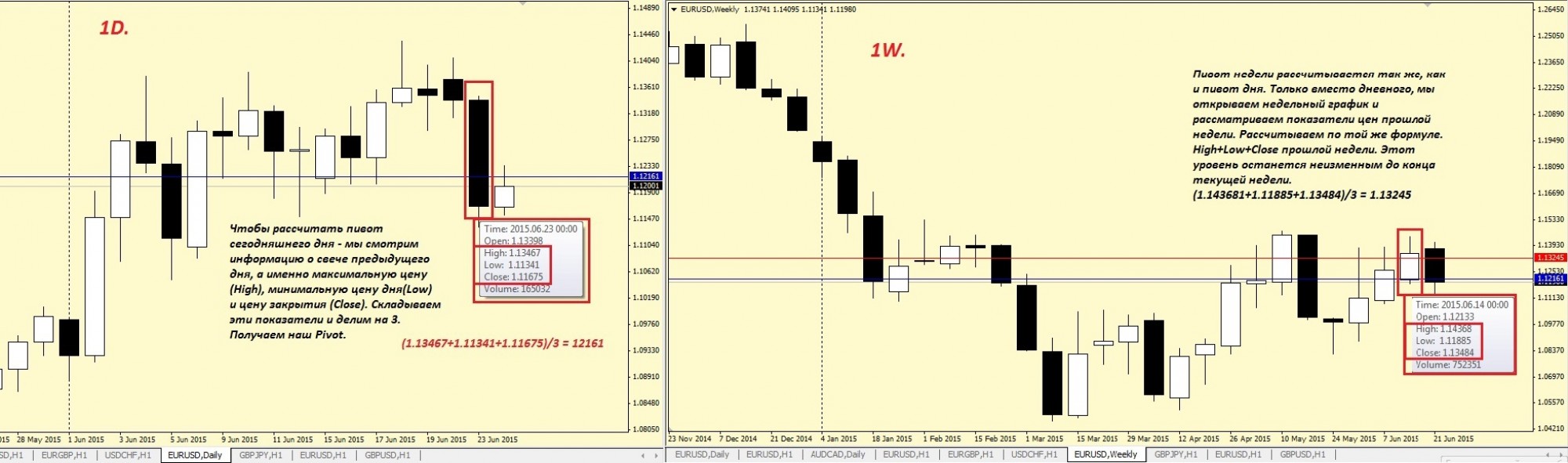 допустим сегодня суббота, 6-е число. Берем данные за прошедшую неделю 1-5 число. Максимальная цена за прошедшую неделю 1,2550; минимальная цена 1,2200; цена закрытия недели 1,2450. Высчитываем недельный пивот: 1,2550 + 1,2200 + 1,2450 = 3,72. Делим это число на три 3,72/3 = 1,24 — это и есть наш недельный пивот уровень. Всю следующую неделю (8-12 число) этот уровень не меняется.