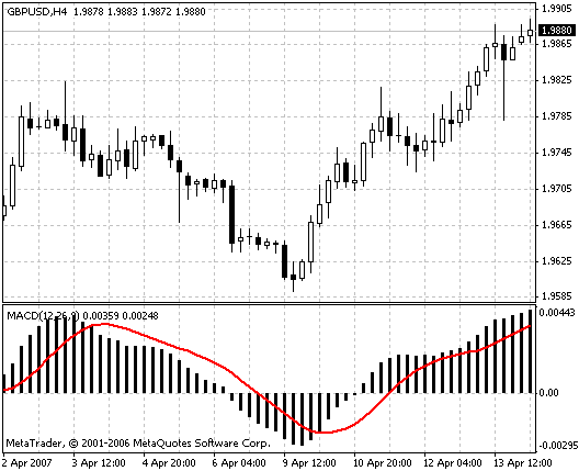 Для нахождения основного тренда и определения его силы методика включает в себя индикатор MACD (12,26.9), движение гистограммы которого позволяет наиболее точно определить тенденцию.