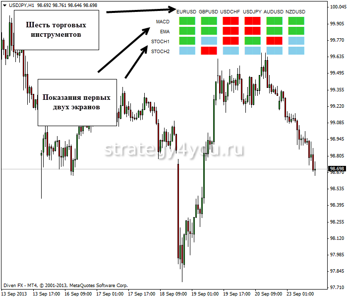 При этом настройка индикатора заключается лишь в изменении периодов для основных показателей: стохастического осциллятора, MACD и скользящей средней.