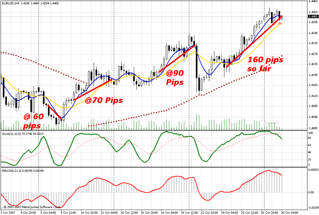 | Стратегия форекс “Атака по тренду” | Примечание Комментарий >> «Стратегия просто прекрасная. Иногда по ней работаю в течении трех лет и даже не знал, что она имеет такое интересное название “Атака по тренду” правда параметр ЕМА-(120), временной интервал тот же, проверочный 15 минут, ордеров по тренду 5-7, да кстати на австралийце эта стратегия тоже неплохо работает и еще пользуюсь отбойным индюком для сбора небольших откатов если вижу их рентабельность.» |