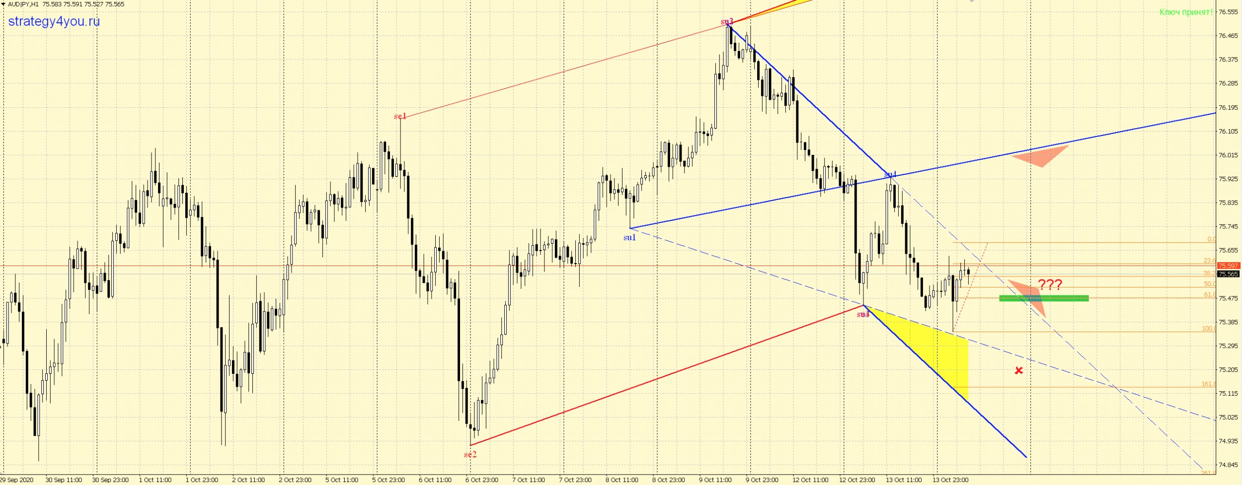 Сформирована ВВ по AUDJPY H1 — вход еще не определен, но ориентировочно: ждем пробоя 2-4, строим фибо и ждем откат к 61,8% — лучше всего, чтоб минимизировать стоп-лосс и увеличить потенциал для ТП. Если события будут идти по этому сценарию или получим хоть какой-то вход с хорошим потенциалом и минимальным стопом, то я сообщу дополнительно.