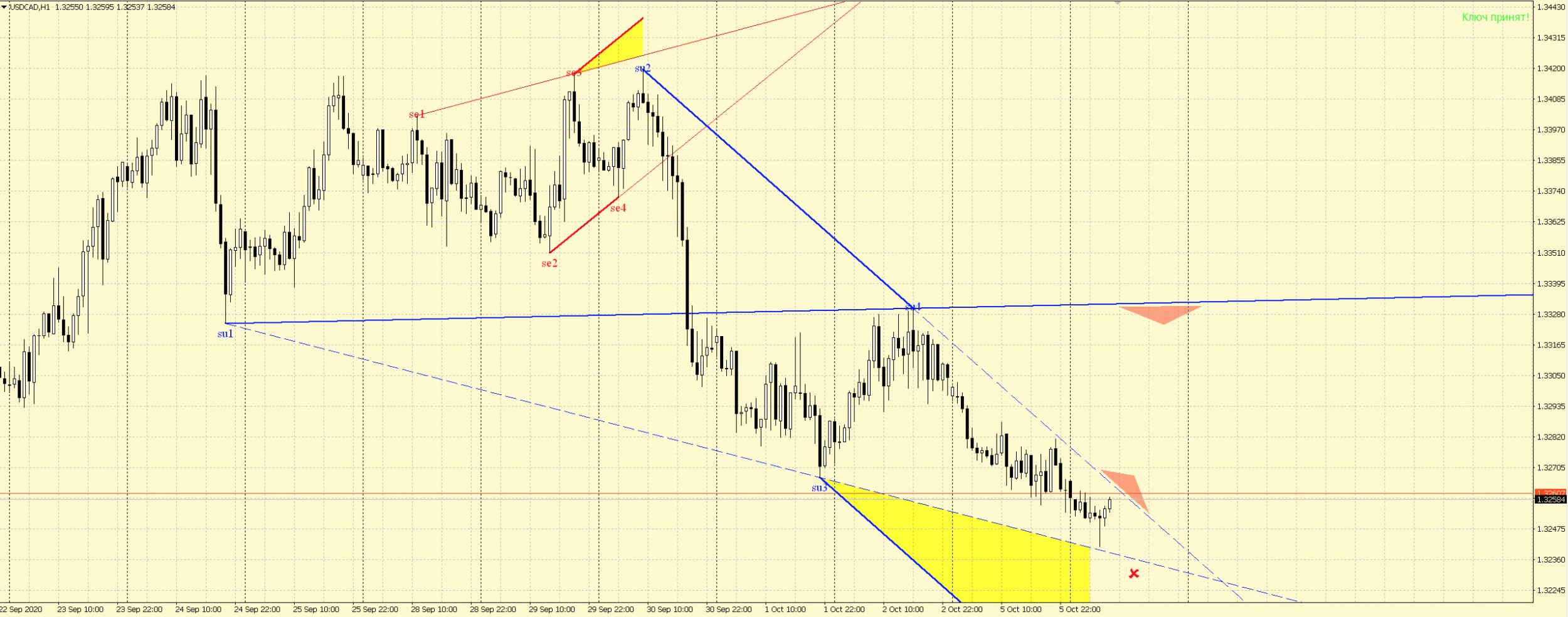 Сформирована волна Вульфа USDCAD, сигналы выделены на рисунке:
