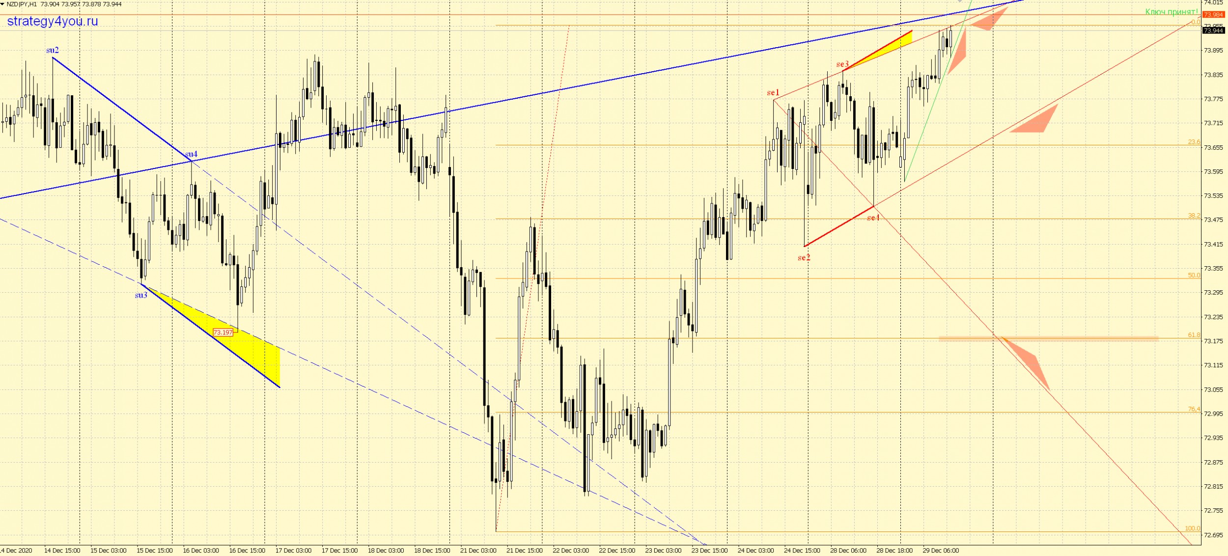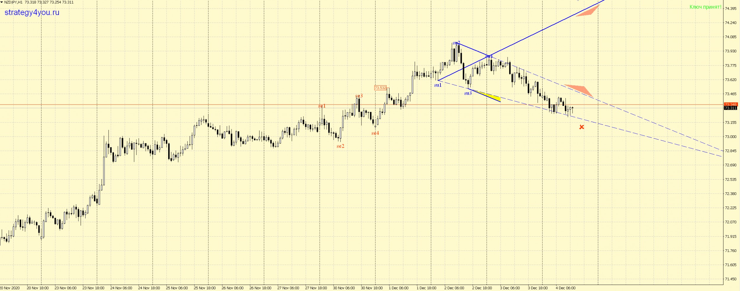 NZDJPY H1 — возможен сигнал на понедельник. Волна конечно немного растянулась во времени, но в любом случаи пробой линии 2-4 + ретест и отбой — сигнал к покупкам. Цель и стоп выделил на рисунке: