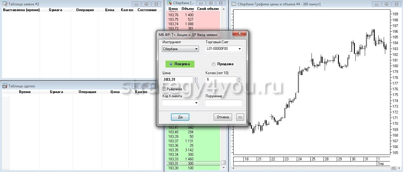 Для покупки актива создают предложение с ценой выше рынка. Например, если стоимость актива составляет 183,30 руб., заказ выставляют по 183,48 руб. за 1 лот. Установленная стоимость выше лучшей цены на продажу, поэтому при подаче сделка будет совершена.
